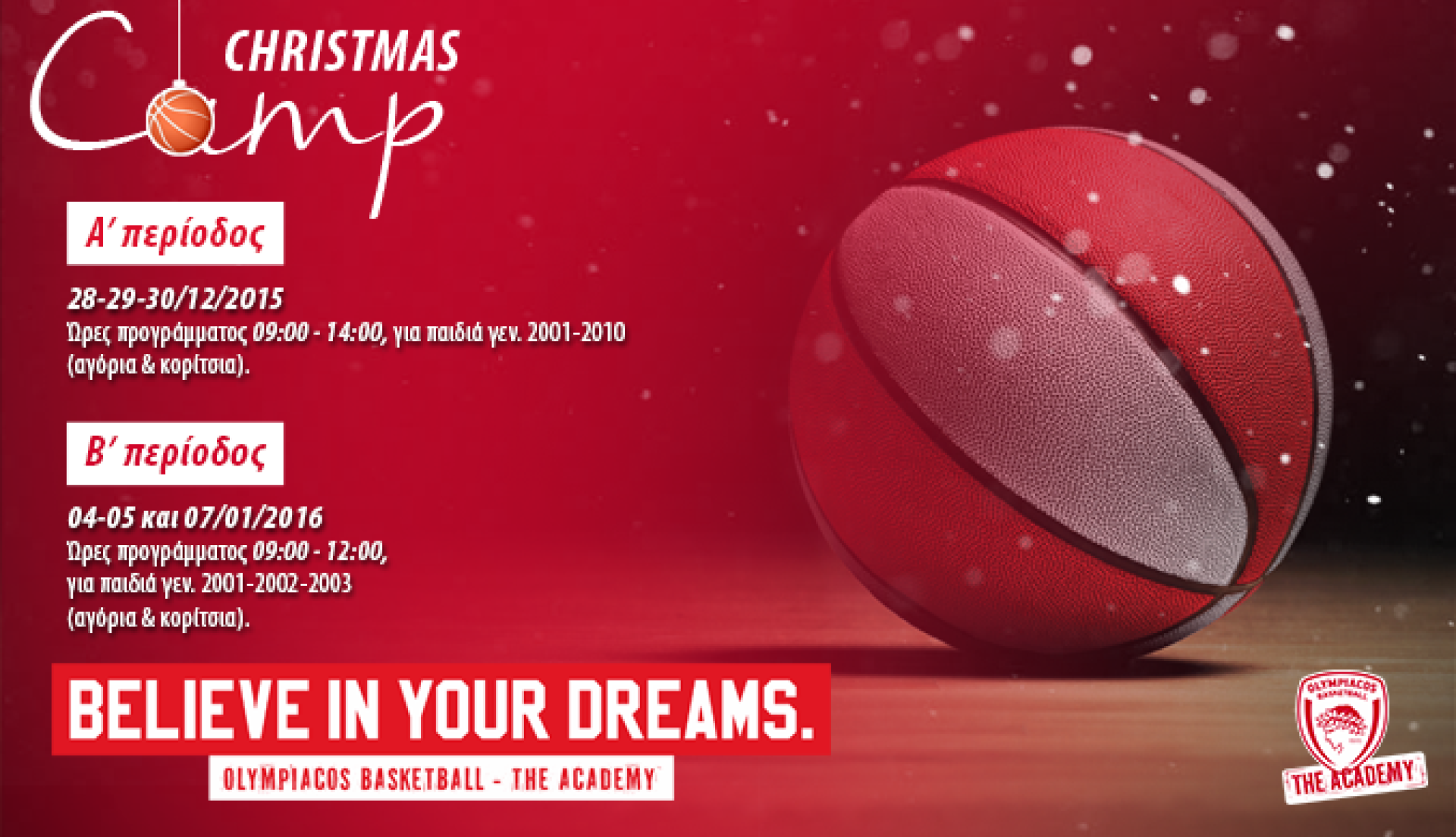 Το camp που έγινε θεσμός επιστρέφει και φέτος. Η Ακαδημία του Ολυμπιακού διοργανώνει Χριστουγεννιάτικο Camp στα γήπεδα του ΣΕΦ, την επίβλεψη των οποίων θα έχουν ο προπονητής της ανδρικής ομάδας του Θρύλου κ. Γιάννης Σφαιρόπουλος και ο Διευθυντής των Ακαδημιών κ. Νίκος Κεραμεύς.
