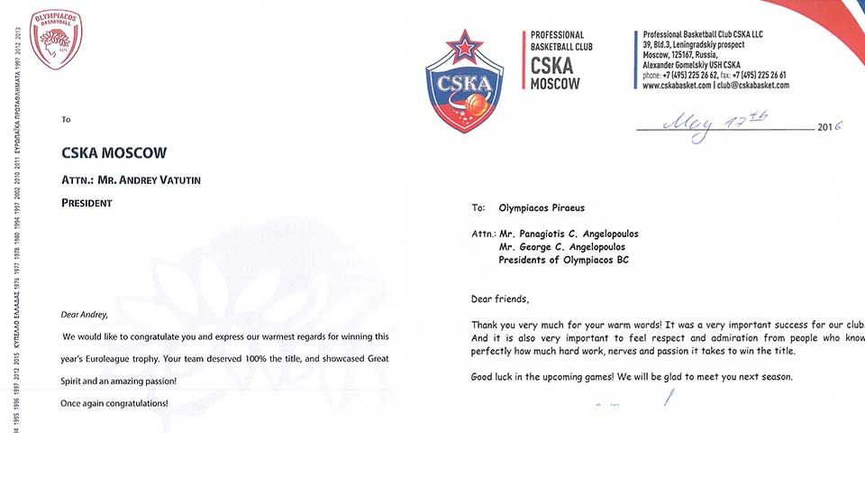 Οι πρόεδροι του Ολυμπιακού κύριοι Παναγιώτης και Γιώργος Αγγελόπουλος απέστειλαν συγχαρητήρια επιστολή στον πρόεδρο της ΤΣΣΚΑ Μόσχας κ. Αντρέι Βατούτιν για την κατάκτηση της φετινής Ευρωλίγκας.