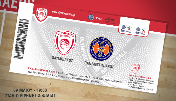 Η Διεύθυνση Εισιτηρίων της Κ.Α.Ε. ΟΛΥΜΠΙΑΚΟΣ ανακοινώνει ότι η διάθεση των εισιτηρίων για τον αγώνα Ελληνικού Πρωταθλήματος με τον ΠΑΝΕΛΕΥΣΙΝΙΑΚΟ Α.Ο.Κ, ο οποίος θα διεξαχθεί το Σάββατο 09/05/2015 μ…