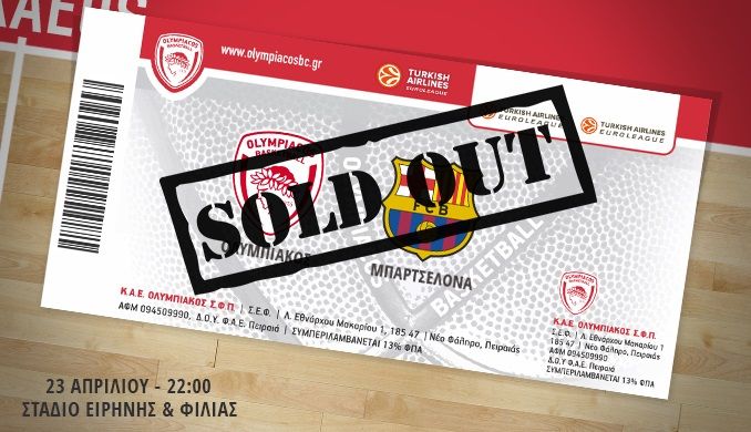 Η ΚΑΕ ΟΛΥΜΠΙΑΚΟΣ ενημερώνει ότι διατέθηκαν όλα τα εισιτήρια του 4ου προημιτελικού της Ευρωλίγκας 2014-15 με αντίπαλο την Μπαρτσελόνα.