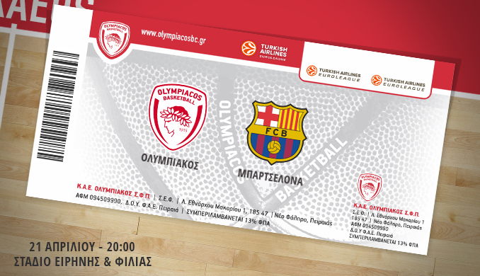 Η Διεύθυνση Εισιτηρίων της Κ.Α.Ε. ΟΛΥΜΠΙΑΚΟΣ ανακοινώνει ότι η διάθεση των εισιτηρίων για τον αγώνα Euroleague, OLYMPIACOS – FC BARCELONA, ο οποίος θα διεξαχθεί την Τρίτη 21/04/2015 με ώρα έναρξης 20…