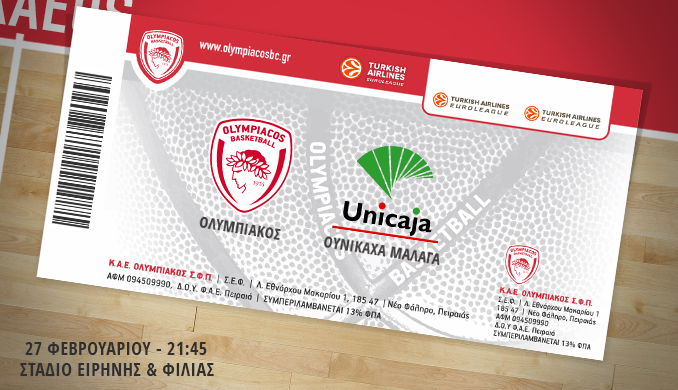 Η Διεύθυνση Εισιτηρίων της Κ.Α.Ε. ΟΛΥΜΠΙΑΚΟΣ ανακοινώνει ότι η διάθεση των εισιτηρίων για τον αγώνα Euroleague, OLYMPIACOS – UNICAJA MALAGA, ο οποίος θα διεξαχθεί την Παρασκευή 27/02/2015 με ώρα έναρ…
