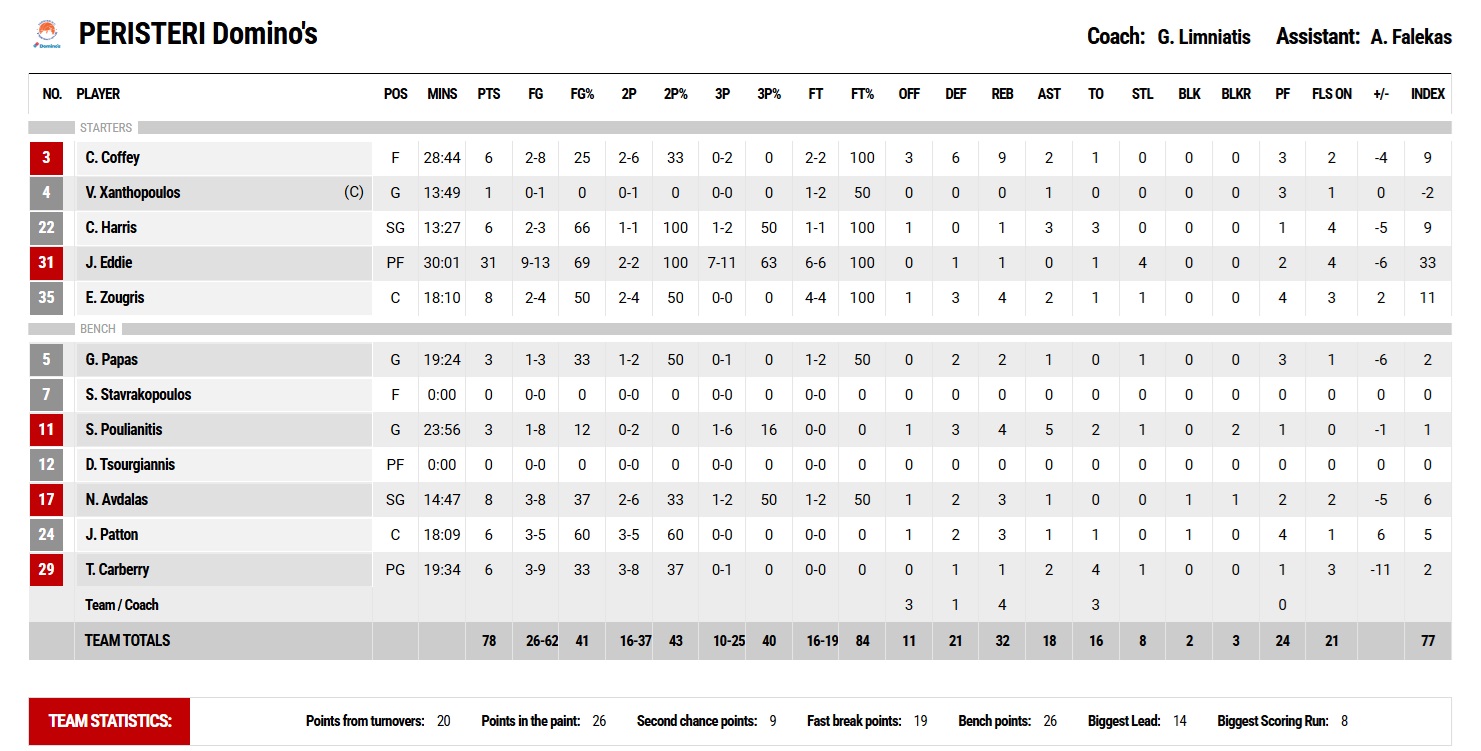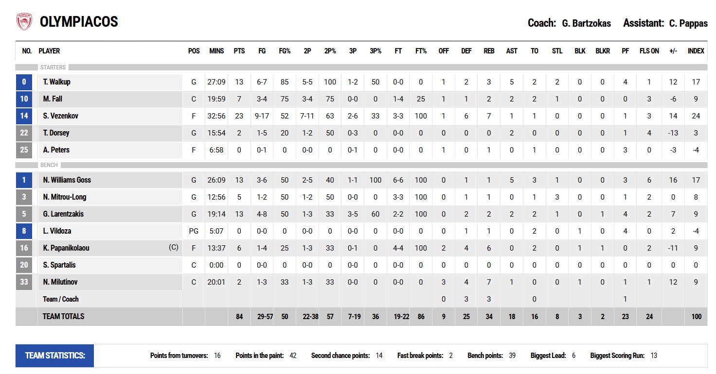 Το νωθρό ξεκίνημα του Ολυμπιακού, σε αντίθεση με την συγκέντρωση του Περιστερίου, έφερε τους φιλοξενούμενους σε θέση οδηγού στο παιχνίδι από νωρίς (8,10, 5'). Η ομάδα μας δεν είχε καθαρό μυαλό στην επίθεση και ένταση στην άμυνά της, με αποτέλεσμα η ομάδα του Λιμνιάτη να πάρει τον έλεγχο του αγώνα, ούσα εύστοχη από την περιφέρεια. Την ίδια στιγμή οι «ερυθρόλευκοι» έδειχναν εκνευρισμένοι (απόδειξη οι δύο τεχνικές ποινές στην πρώτη περίοδο) και βιαστικοί στις επιλογές τους στην επίθεση. Δύο διαδοχικά, αναπάντητα τρίποντα από τους Περιστεριώτες έκαναν το 14-24 (8'), με το δεκάλεπτο να ολοκληρώνεται στο 20-27. Στη δεύτερη περίοδο, ο Γιαννούλης Λαρεντζάκης ευστόχησε στο πρώτο τρίποντο της ομάδας μας (25-31, 14'), με τους φιλοξενούμενους να συνεχίζουν προηγούμενοι στο σκορ φτάνοντας ως το +14 (25-39, 15'). Στο τελευταίο πεντάλεπτο της περιόδου, με πρωταγωνιστή επιθετικά τον Σάσα Βεζένκοφ και αυξάνοντας την πίεση στην άμυνά τους, οι Πειραιώτες έτρεξαν ένα σερί 11-0, μαζεύοντας το παιχνίδι στο 43-44, με το οποίο ολοκληρώθηκε το πρώτο μισό.