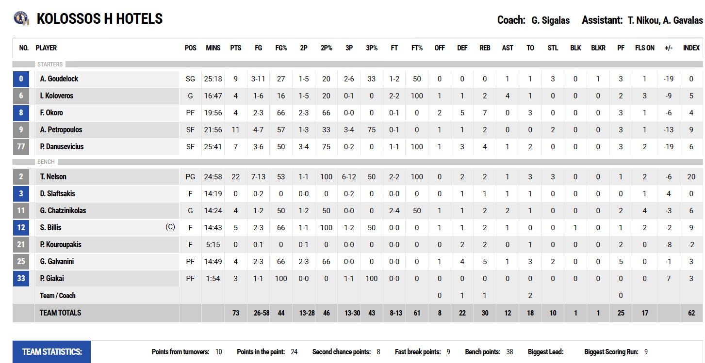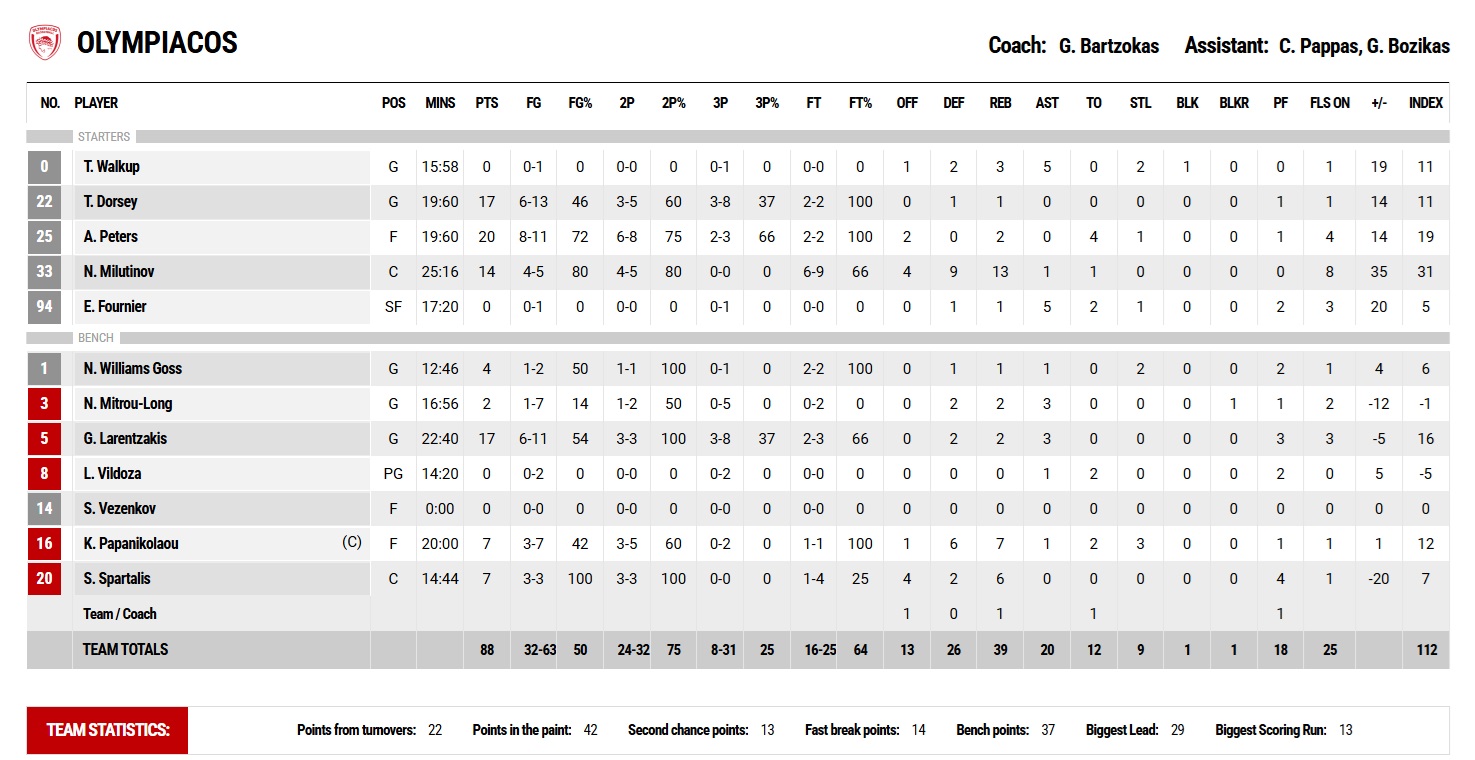 Ο Ολυμπιακός ξεκίνησε σοβαρός και συγκεντρωμένος το ματς με τον Κολοσσό στη Ρόδο. Οι «ερυθρόλευκοι» επέβαλαν τον ρυθμό τους από νωρίς, με πίεση στην άμυνα και ωραίες συνεργασίες στην επίθεση (0-7, 2'). Ο Τάιλερ Ντόρσεϊ με 5 γρήγορους πόντους ηγήθηκε της ομάδας μας επιθετικά, πριν αναλάβει δράση ο Άλεκ Πίτερς με 8 διαδοχικούς αναπάντητους πόντους (4-17, 6'). Οι γηπεδούχοι δεν μπορούσαν να βρουν λύσεις επιθετικά απέναντι στην άμυνα του Ολυμπιακού και αδυνατούσαν να ανακόψουν τον επιθετικό μας ρυθμό (4-22, 8'). Με 1:50 για την ολοκλήρωση τη πρώτης περιόδου, ο Στέφανος Σπάρταλης πέρασε στο παρκέ στη θέση του Νίκολα Μιλουτίνοφ, δεδομένης της απουσίας άλλων λύσεων στη θέση «5», με το δεκάλεπτο να κλείνει στο 8-24. Η εικόνα της αναμέτρησης δεν άλλαξε στη δεύτερη περίοδο, με τον Ολυμπιακό -που έπαιξε με τον Κώστα Παπανικολάου στο «4» ένεκα των απουσιών- να κυριαρχεί κατά κράτος του αντιπάλου του προσφέροντας θέαμα στον κόσμο που βρέθηκε στο γήπεδο. Ένα τρίποντο του Γιαννούλη Λαρεντζάκη ανέβασε τη διαφορά στο +22 (8-30, 13'), ενώ μια ωραία συνεργασία του Έλληνα διεθνούς γκαρντ με τον αρχηγό διαμόρφωσε το +26 (9-35, 15'). Ο Κολοσσός εκμεταλλεύτηκε στη συνέχεια κάποια άστοχα σουτ της ομάδας μας, ρίχνοντας προσωρινά τη διαφορά κάτω από τους 20π. (25-44, 41"), με το ημίχρονο να ολοκληρώνεται τελικά στο 25-46.