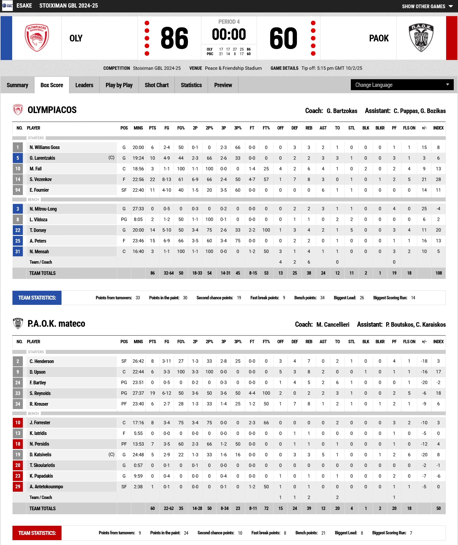 Δεκάλεπτα: 17-21, 34-35, 61-43, 86-60