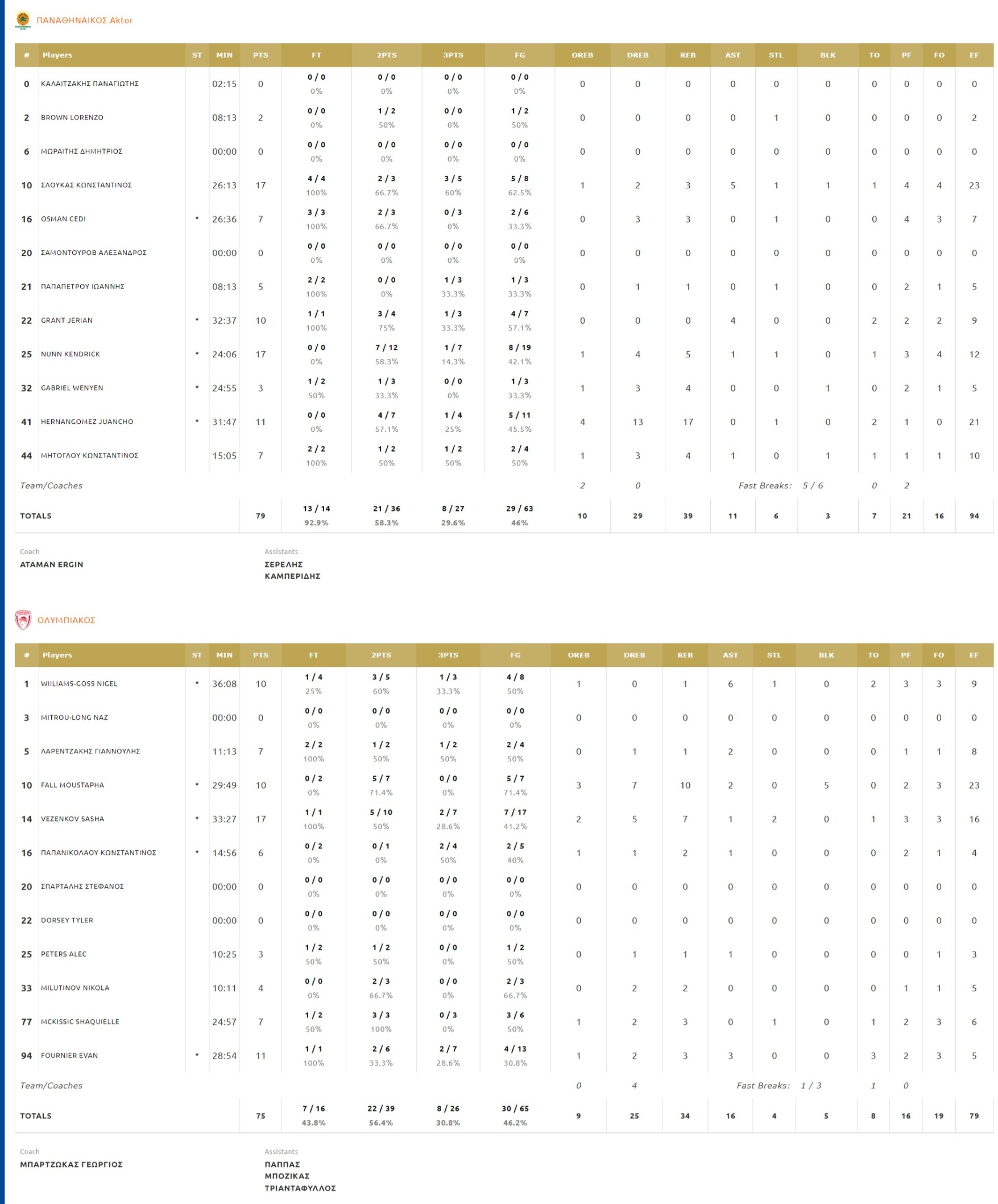 Το νευρικό ξεκίνημα των πρώτων τριών λεπτών, έφερε τον Παναθηναϊκό σε θέση οδηγού (6-0), όμως η ομάδα μας είχε απάντηση. Με δύο άμυνες και πέντε πόντους του Σάσα Βεζένκοφ (6-5, 5') έφερε αρχικά το παιχνίδι στον πόντο και με καλάθι του Φαλ προσπέρασε (6-7). Το ματς ήταν ισορροπημένο για λίγα λεπτά, όμως χάρη σε προσωπική ενέργεια του Γουίλιαμς - Γκος, επιθετικό ριμπάουντ του Σάσα Βεζένκοφ και τρίποντο στην εκπνοή του Γιαννούλη Λαρεντζάκη η ομάδα μας βρέθηκε στο +5 στο τέλος της πρώτης περιόδου (16-21). Ο Έλληνας γκαρντ συνέχισε στη δεύτερη περίοδο από εκεί που σταμάτησε στην πρώτη, με τους Πειραιώτες να κρατούν το προβάδισμά τους (23-26, 14'). Κάποιες κακές αντιδράσεις στην άμυνα, έφεραν το 5-0 του Παναθηναϊκού (28-27) όμως η «ερυθρόλευκη» απάντηση ήταν άμεση, με τον Μους Φαλ να προσφέρει και στις δύο πλευρές του παρκέ και τους Εβάν Φουρνιέ και Σακίλ ΜακΚίσκ να πρωταγωνιστούν επιθετικά, ο Ολυμπιακός πήγε στ' αποδυτήρια για το ημίχρονο στο +4 (30-34).