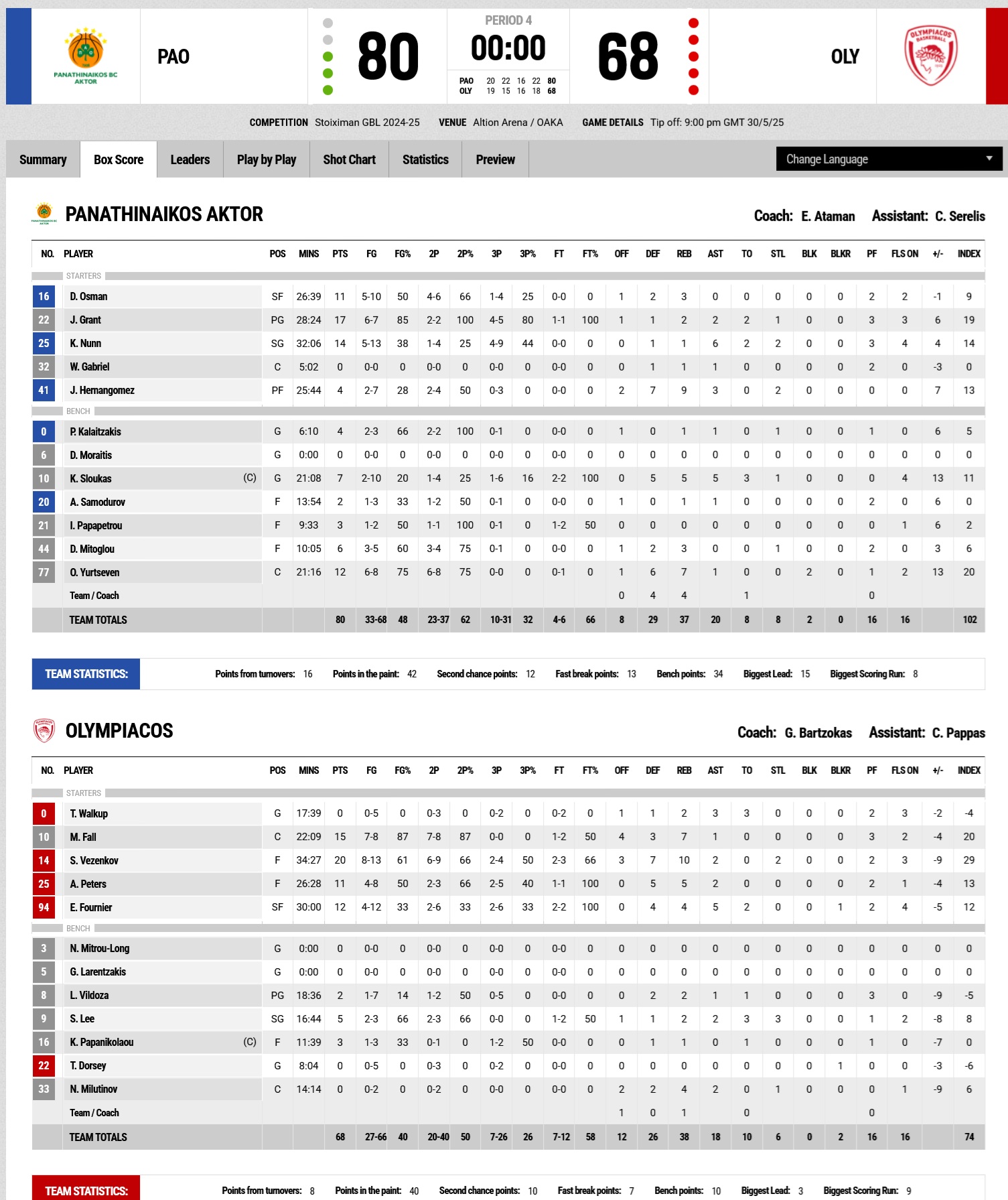Εβάν Φουρνιέ και Άλεκ Πίτερς έδωσαν λύσεις στην αρχή της τρίτης περιόδου (44-38), με τον Παναθηναϊκό να συνεχίζει να βρίσκει σκορ από την περιφέρεια (47-38). Φουρνιέ και Βεζένκοφ απάντησαν (49-44, 26'), αλλά η έλλειψη έντασης στην άμυνα έφερε το +10 των γηπεδούχων (54-55), με την περίοδο να κλείνει στο 58-50. Μουστάφα Φαλ και Σέιμπεν Λι έδωσαν σκορ στην ομάδα μας στην αρχή της τελευταίας περιόδου (62-56, 33'), όμως ο Παναθηναϊκός συνέχισε να κρατά τα ηνία του αγώνα (68-58). Ο Εβάν Φουρνιέ έριξε τη διαφορά σε μονοψήφιο επίπεδο (68-61, 35'), όμως αστοχία και έλλειψη έντασης στην άμυνα έφεραν το 8-0 των γηπεδούχων (74-61, 36'). Ο Σάσα Βεζένκοφ έριξε τη διαφορά στους 10 πόντους (76-66, 38'), αλλά η ομάδα μας δεν κατάφερε να πάρει τη νίκη (80-68).