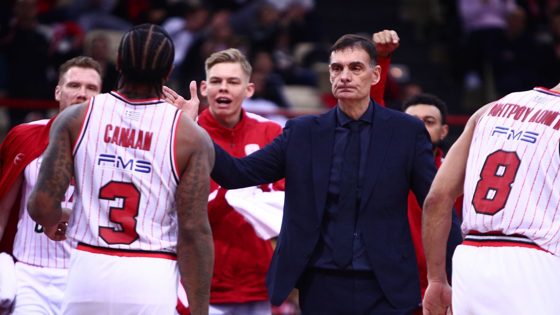 «Θα ήθελα να ευχαριστήσω τους φιλάθλους μας που ήρθαν Σάββατο βράδυ σε ένα παιχνίδι σαν αυτό. Για μία ακόμη φορά είναι κοντά στην ομάδα και είναι πολύ σημαντικό», δήλωσε ο προπονητής των «ερυθρολεύκων», Γιώργος Μπαρτζώκας. «Ήταν από τα πιο άβολα παιχνίδια που έχω κοουτσάρει ποτέ. Θυμήθηκα τις εποχές που ήμουν στην ΕΣΚΑ, που έπρεπε να κάνουμε αλχημείες για να δείξουμε κάτι στο γήπεδο. Έτσι έγινε και σήμερα, με παίκτες που έπαιξαν παραπάνω χρόνο από ότι έπρεπε. Με παίκτες που έπαιξαν σε άλλη τελείως θέση. Παρόλα αυτά το ότι κερδίσαμε είναι πάντα σημαντικό ακόμα και με αυτά τα δεδομένα. Ο Ολυμπιακός πρέπει πάντα να κερδίζει. Φτάσαμε στο σημείο να έχουμε έξι ψηλούς και οι πέντε να είναι έξω. Είχαμε μόνο τον Τανούλη. Όμως, έτσι είναι η κατάσταση, ας ελπίσουμε πως την Τρίτη θα είμαστε περισσότεροι γιατί είναι ένα πολύ σημαντικό ματς για την ομάδα μας. Καλή συνέχεια στον ΠΑΟΚ».