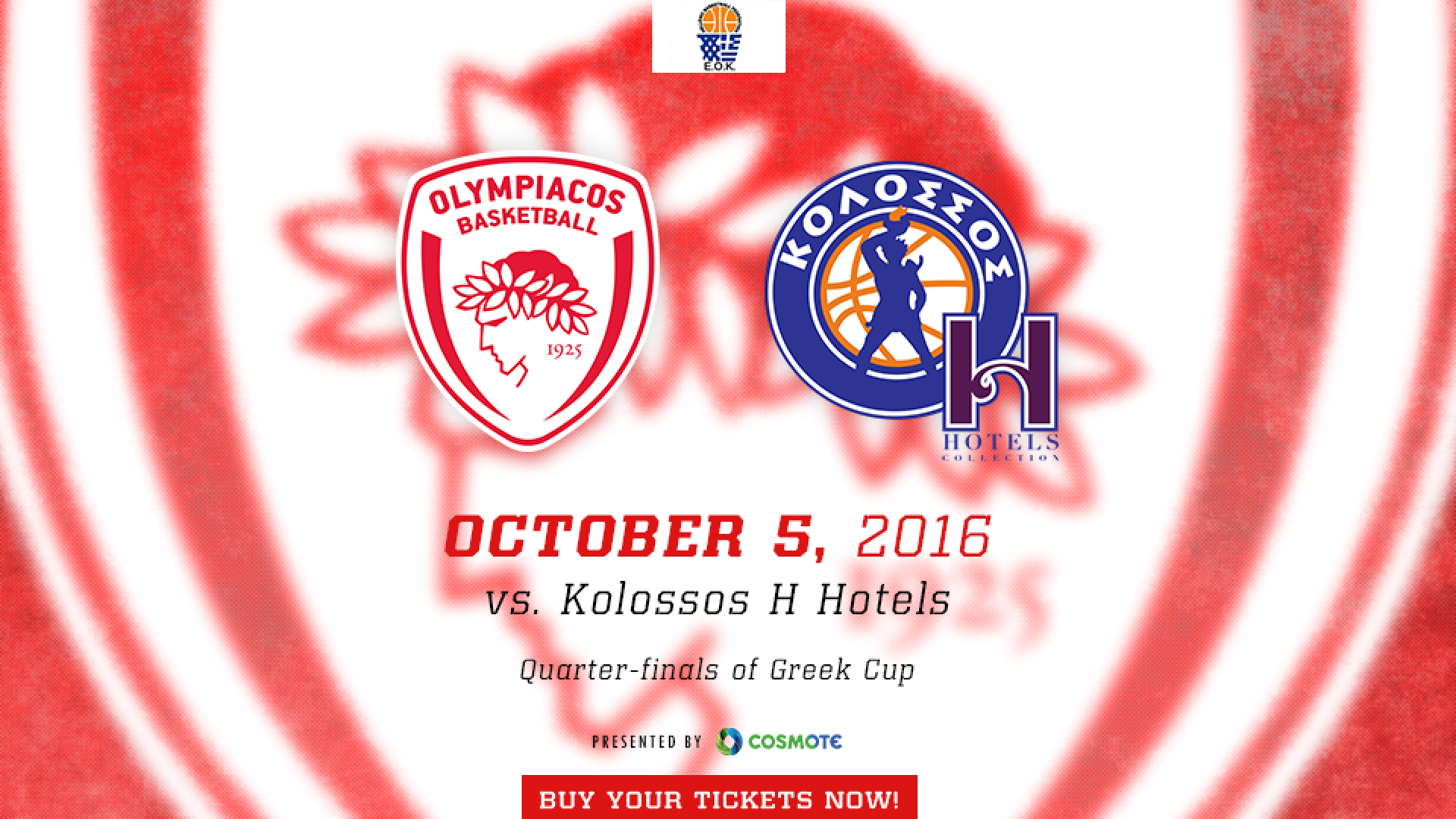 Η Διεύθυνση Εισιτηρίων της Κ.Α.Ε. ΟΛΥΜΠΙΑΚΟΣ ανακοινώνει, ότι η διάθεση των εισιτηρίων για τον Αγώνα Κυπέλλου Ελλάδος Ανδρών με τον ΚΟΛΟΣΣΟ H HOTELS, ο οποίος θα διεξαχθεί την Τετάρτη 05/10/2016 στις 16:00, θα πραγματοποιηθεί ως εξής: