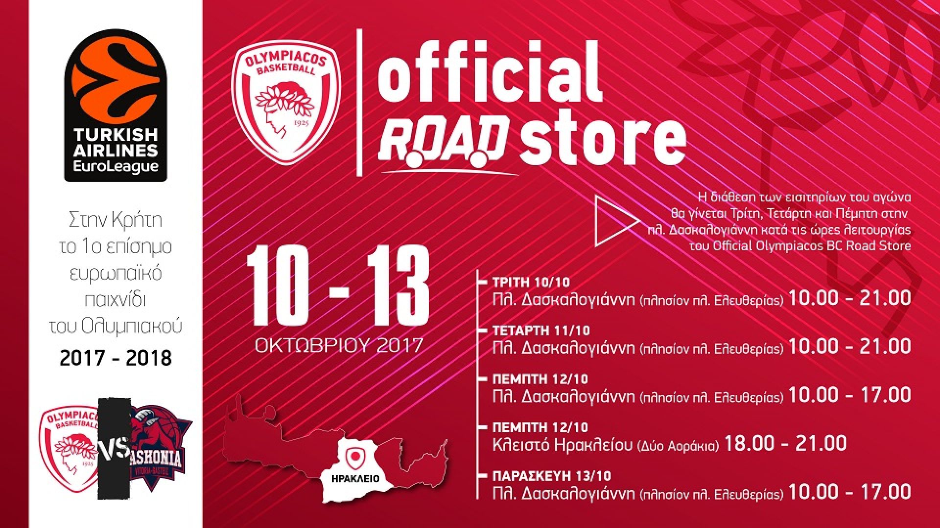 Επίσης, διάθεση εισιτηρίων για τον συγκεκριμένο αγώνα θα γίνεται από το Official Olympiacos BC Road Store στην πλ. Δασκαλογιάννη τις ημέρες Τρίτη, Τετάρτη και Πέμπτη κατά τις ώρες λειτουργίας του.