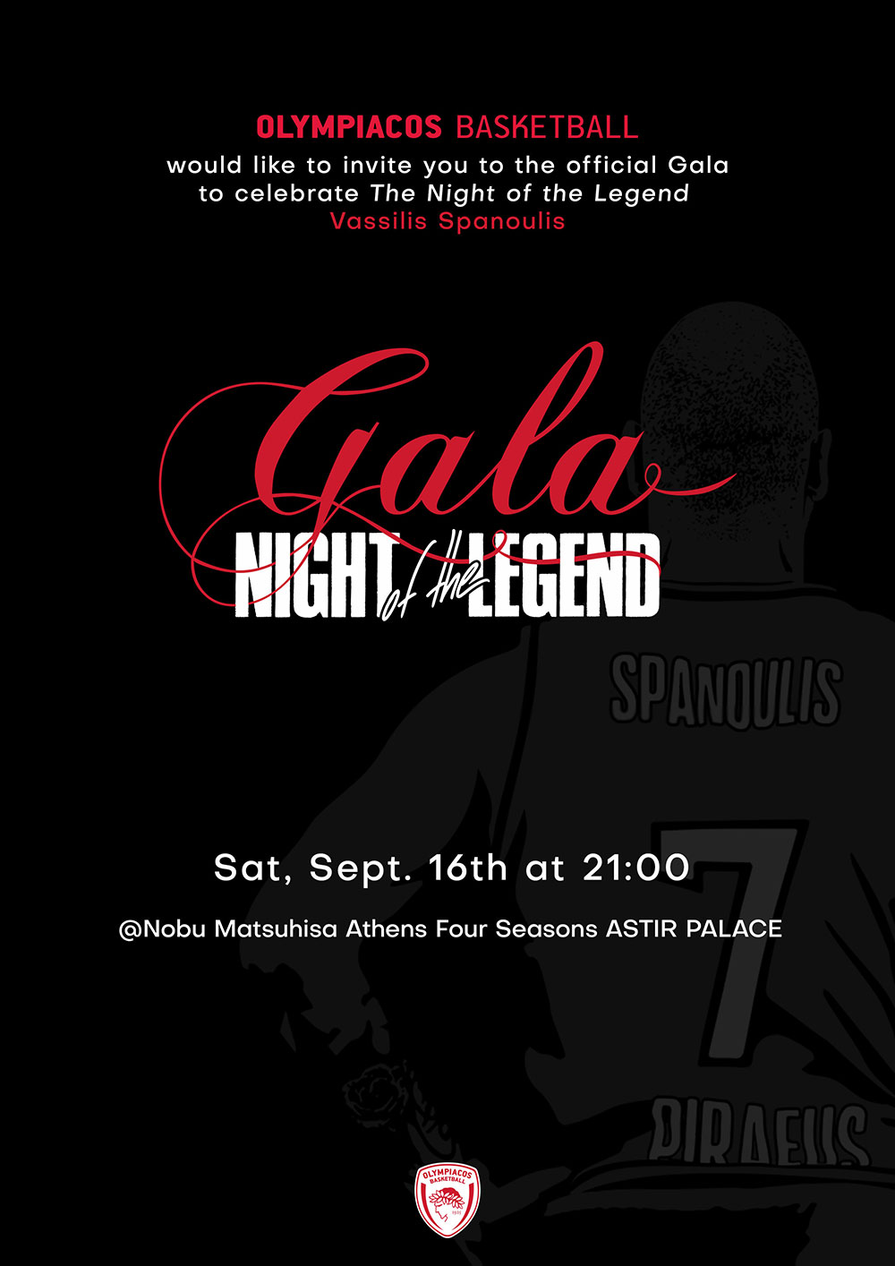 Η Κ.Α.Ε. Ολυμπιακός επιθυμεί να σας προσκαλέσει στην τιμητική εκδηλώση που θα πραγματοποιηθεί προς τιμήν του Βασίλη Σπανούλη,