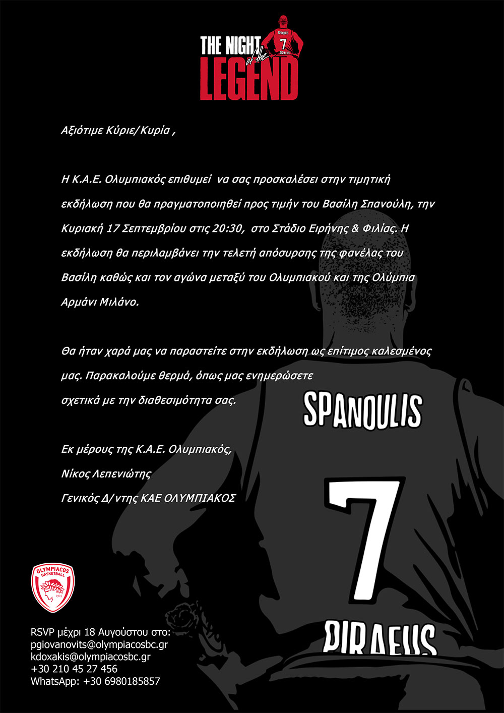 Η Κ.Α.Ε. Ολυμπιακός επιθυμεί να σας προσκαλέσει στην τιμητική εκδήλωση που θα πραγματοποιηθεί προς τιμήν του Βασίλη Σπανούλη,