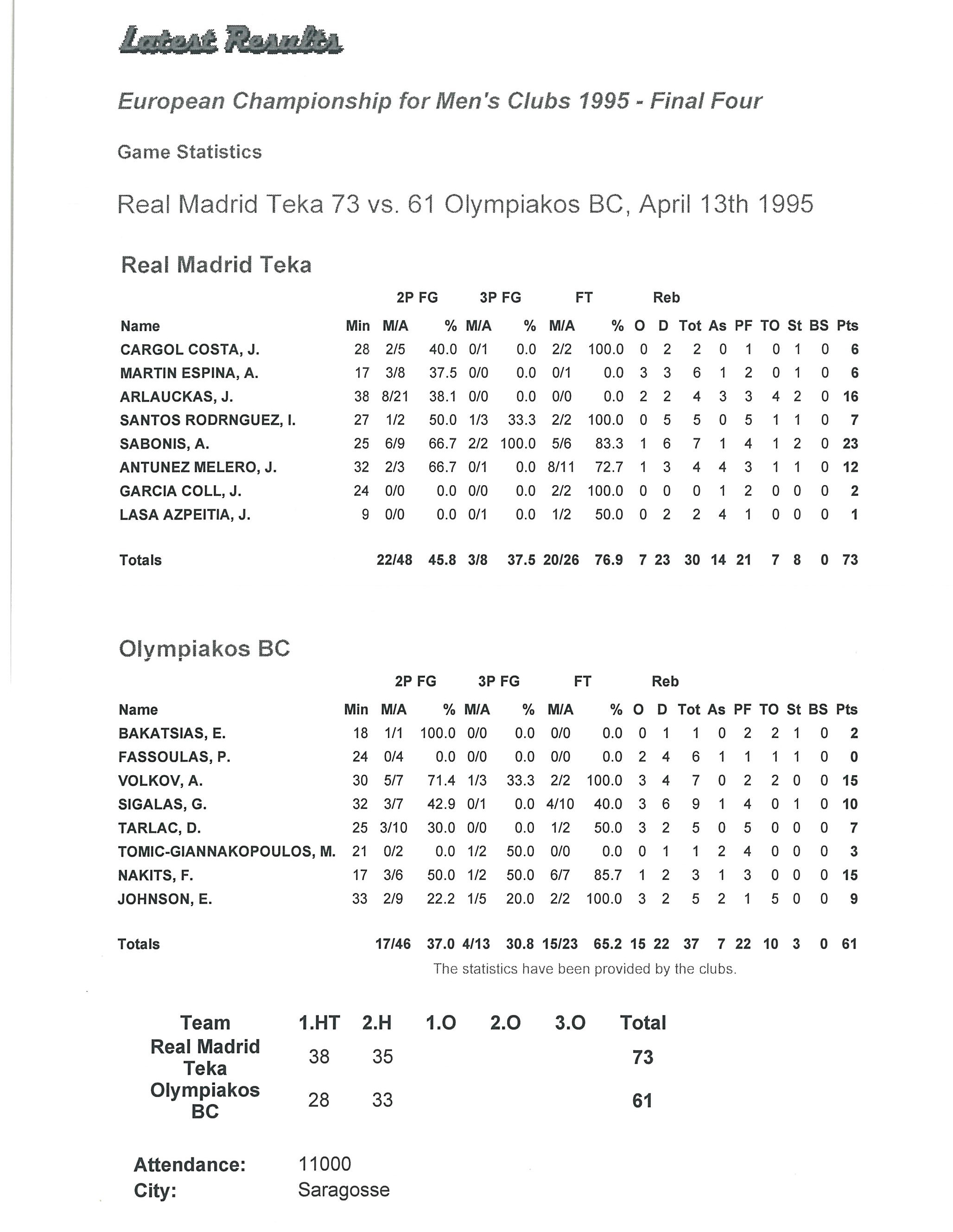 | 13/04/1995 | REAL MADRID – OLYMPIACOS | 73-61 |