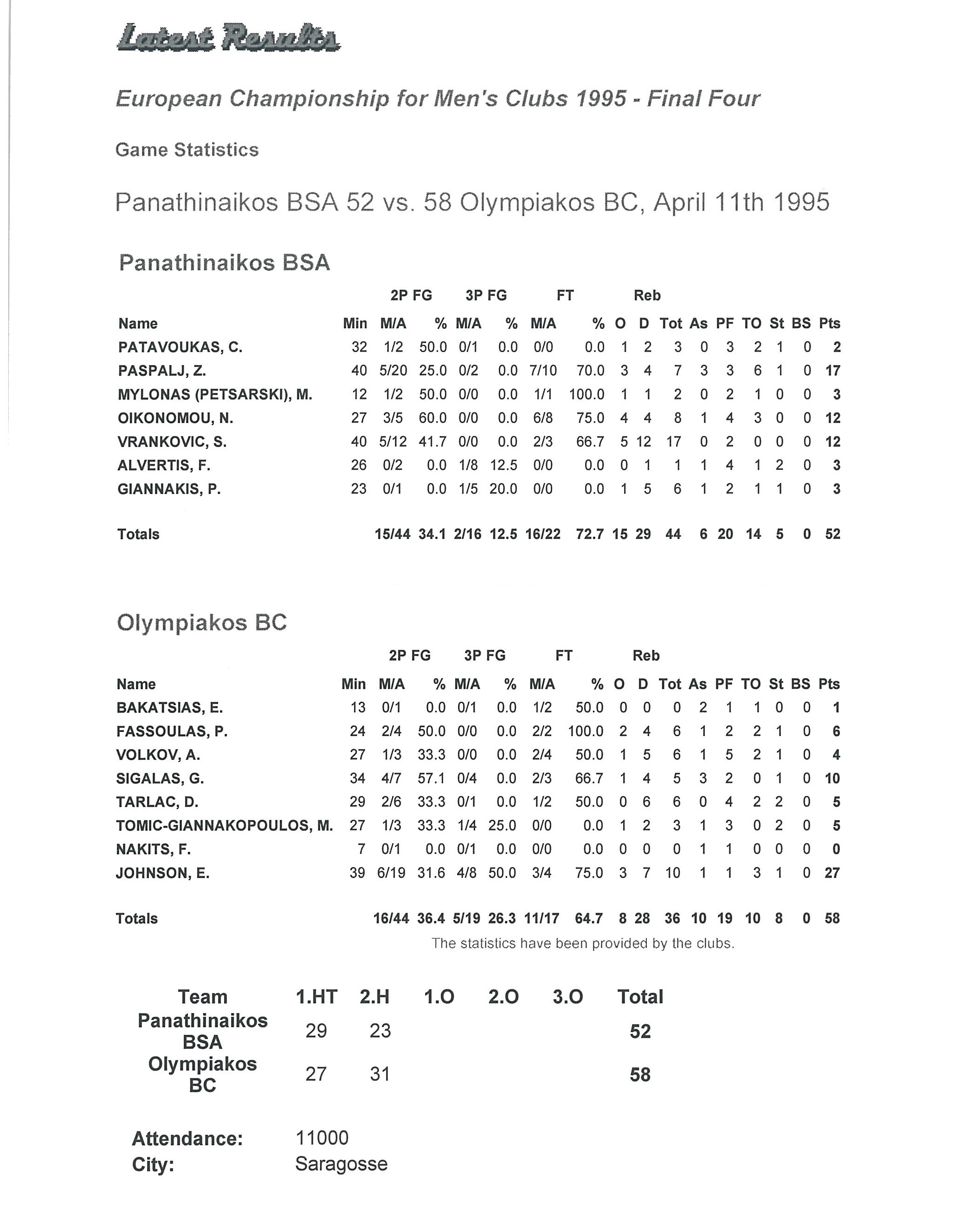 | 19/01/1995 | CIBONA – OLYMPIACOS | 60-69 |