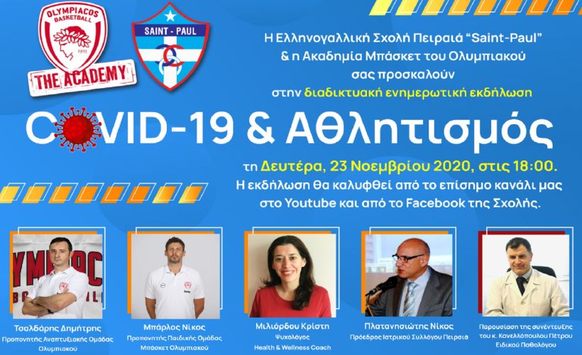 The Olympiacos BC Academies together with Saint Paul invite you to the “Covid-19 & Sports” webinar co-sponsored on Monday, November 23, at 17:00 CET.