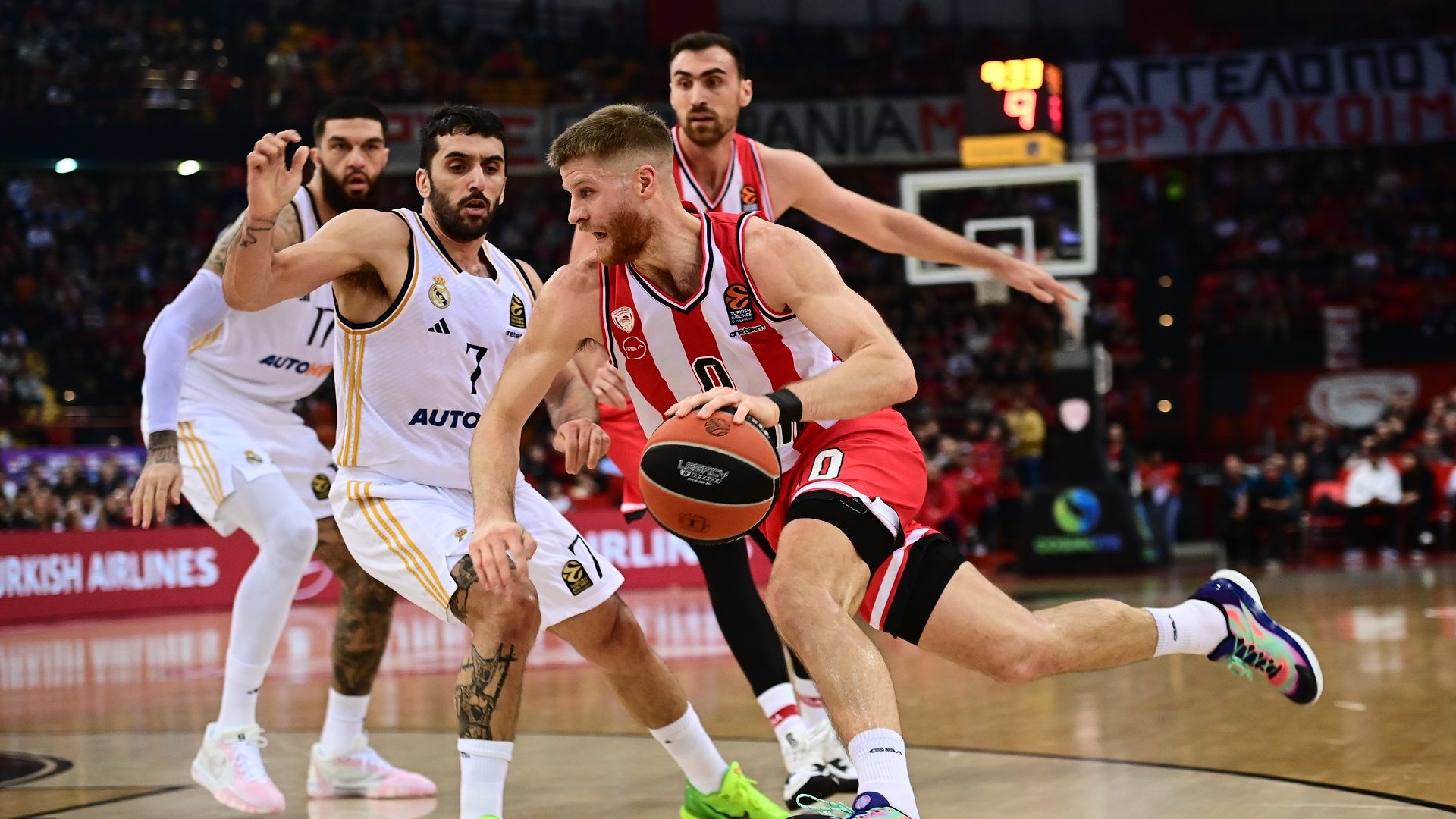 The tragically off-target Olympiacos during the first quarter (1/9), found scoring with Walkup and McKissic and closed in to one point (27-28). However, Real succeeded to once again gain distance, mainly with Hezonja (+8, 29-37 at 18'). The 'red & whites' did not give up the fight. They pressed in defense and running a partial 7-0 with Fall and Larentzakis closed in to one point (36-37) at 20'.