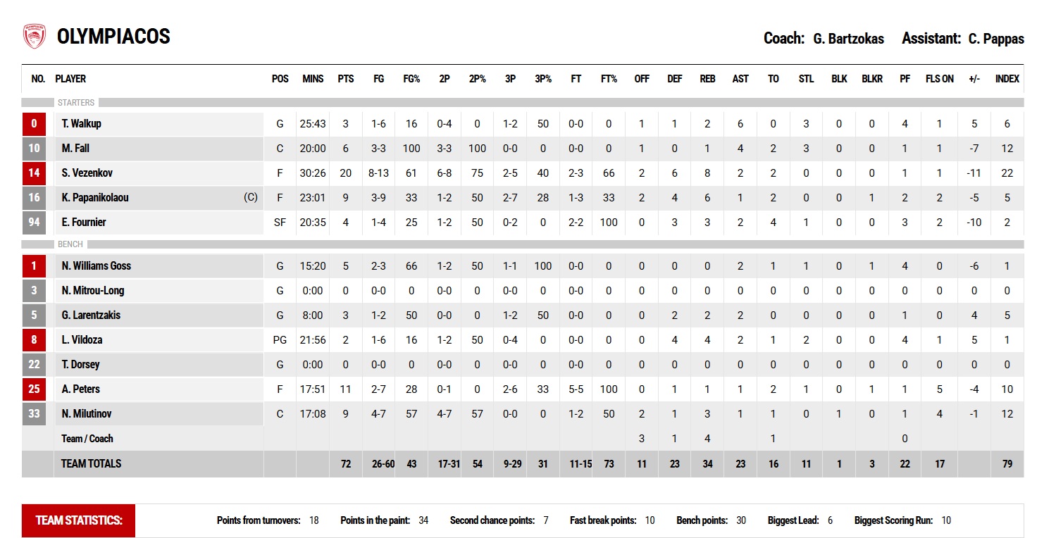 Olympiacos made a good beginning in the game, with efficient ball movement and Moustapha Fall finishing plays at the rim, while the team was also focused on the defensive end of the game (4-10, 4'). However, the hosts' pressure on the ball led the guests to numerous turnovers and the lead changed hands (14-12, 7'). Our team was not shooting well from the long range and did not have the necessary intensity in defense, resulting in a partial 15-2 (19-12, 8') that caused to trail by 9 at the end of the quarter (25-14). In the second quarter, the 'red & white' defense continued being ineffective, while offensive wise clear thinking was absent (31-17, 12'). The first three for our team came by Giannoulis Larentzakis (31-20), for two back-to-back ones by Alec Peters to follow (35-26, 17') and an eventual 10-0 for the guests who 'fed' Milutinov and dropped the difference to 5 points (35-30, 18'). Half-time ended at 38-30, following a barrage of lost defensive rebounds.