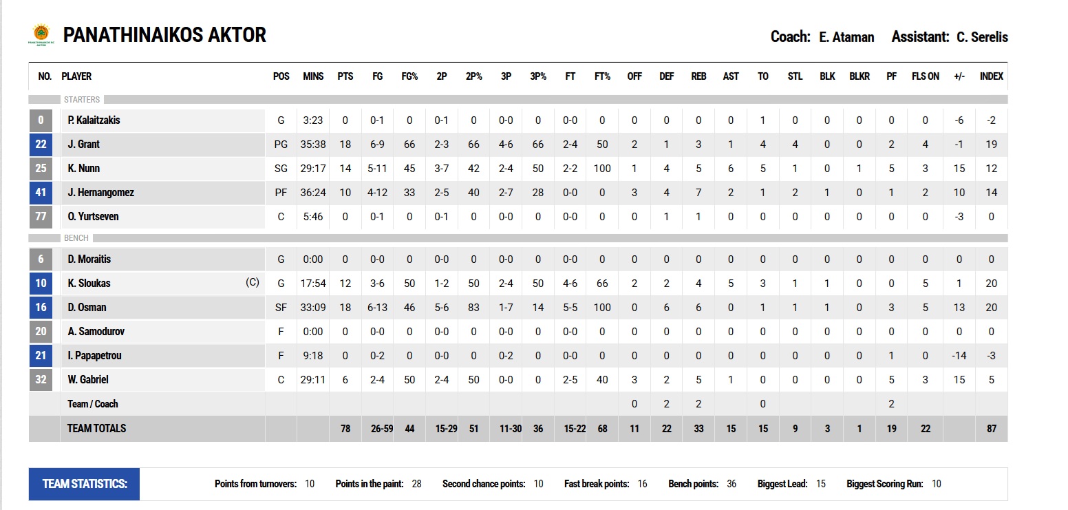 The next quarter began with two 3-pointers by Thomas Walkup and Sasha Vezenkov and 2 more points by the latter that made the score 43-38, (13'). Our team played with better concentration on its defensive duties and more patience in defense, closing in to 3 points, thanks to a three by Kostas Papanikolaou (46-43, 15'). The mini 5-0 run by the hosts was again interrupted by a three scored by the captain (51-46), with Sasha Vezenkov taking over to tie the score 55-55 (28') and a one-point lead (56-57). In the 1:21'' left in the quarter, though, Panathinaikos run a 5-0 partial that made the score 61-57. In the last ten minutes, a 3-pointer by Williams-Goss made for a 1-point game (61-60), while Nikola Milutinov gave our team the lead (61-62, 31'). Panathinaikos got to strike from the perimeter taking the lead once again (72-65, 35'). Our team succumbed to turning the ball over, entered the final two minutes trailing by 9 (76-68, 38') and lost 78-72.