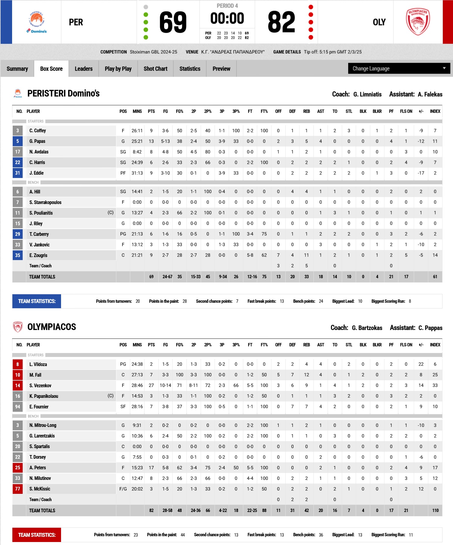 Our team made a strong start against Peristeri. With focused defense and good ball movement, they went on a 11-0 run and took the lead (0-11, 3'). However, the hosts got to respond. Taking advantage of a relaxed Olympiacos' defense, they overtook with a 20-9 run (22-20). In the second quarter, a "and-one" by Alec Peters and two free throws by Mitrou-Long brought the game to a one-point difference (26-25, 12'). Sasha Vezenkov continued to lead offensively (33-31, 16'), but the lack of intensity on defense, combined with mistakes and missed three-pointers, allowed Peristeri to go up by 10 points (43-33, 18'), with the halftime score at 45-40.