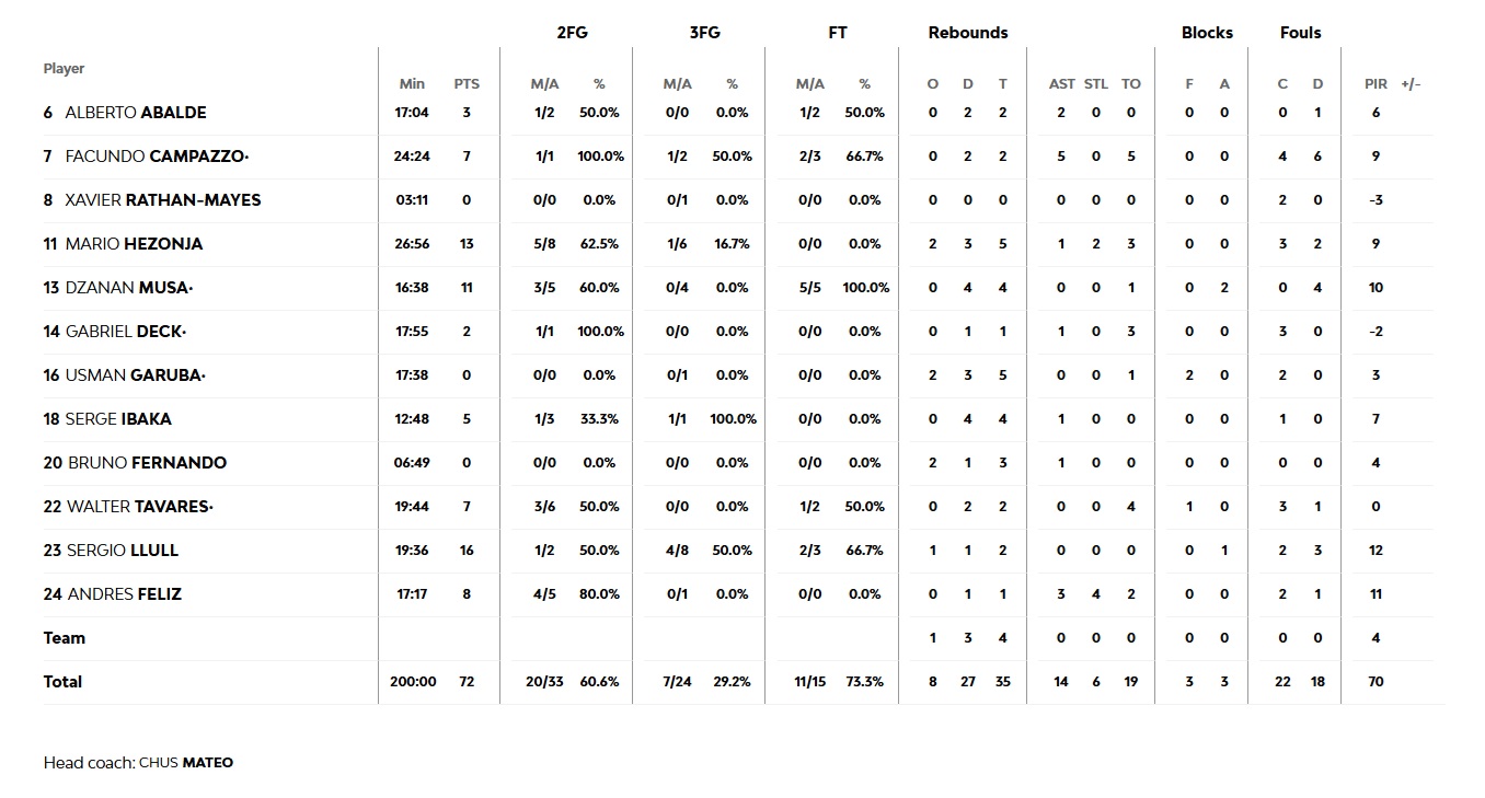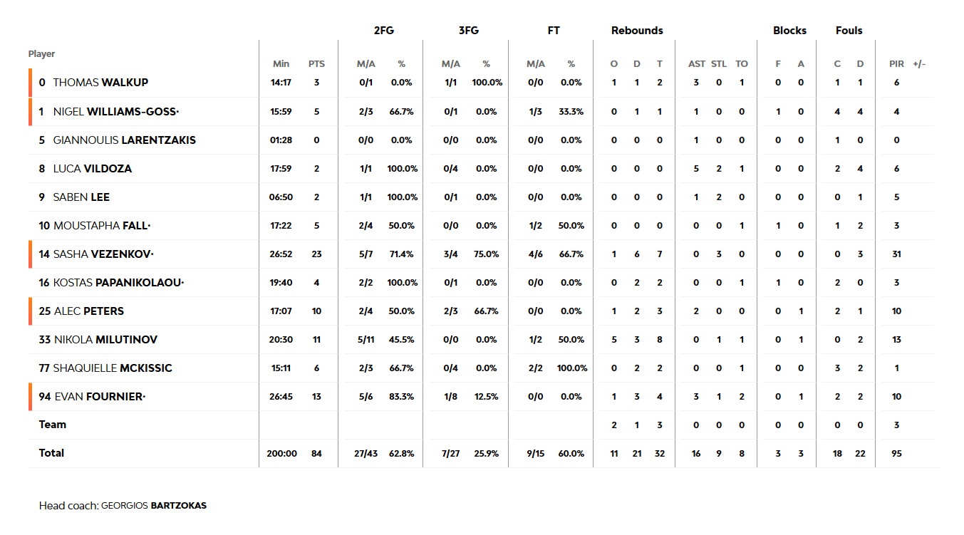 In the early minutes of the final period, Alec Peters stepped up offensively (70-53, 33'). Real mounted a final comeback attempt with three-point shooting, but Walkup, Fournier, and Peters all had their own long-range answers (82-67), with the game finishing 84-72 and Olympiacos securing the 1-0 lead in the series.