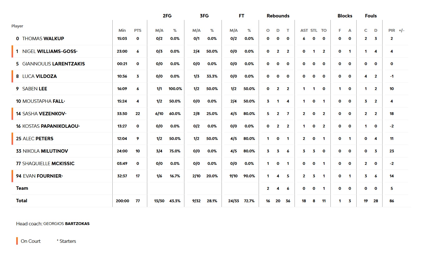Olympiacos started the game nervously, with Real taking control early on (2-7, 2'). Rushed decisions and poor shooting led to bad defensive transitions, with the Madrid team striking from the perimeter. Our team lacked clarity and was trailing the entire quarter (6-14, 6'). Sasha Vezenkov hit the first (and only) three-pointer for Olympiacos in the opening quarter, which ended 15-25. At the start of the second one, Nikola Milutinov and Alec Peters stepped up offensively (19-27, 13'), but the poor three-point shooting continued, and combined with some turnovers, Real extended their lead to 10 points again (24-34, 15'). With increased defensive intensity, our team kept Real from pulling away further, while a much-needed three-pointer by Shaquielle McKissic fired up the crowd. Another one followed from Evan Fournier (36-36), and an intelligent finish by Sasha Vezenkov gave Olympiacos their first lead just before halftime (38-38).