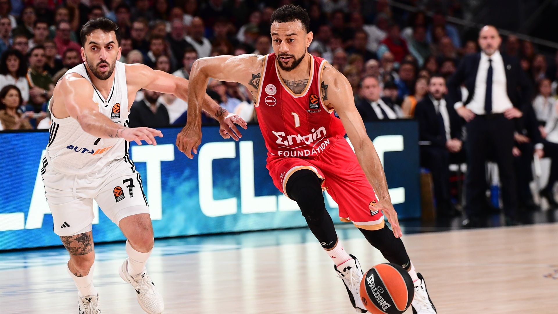 Olympiacos started the game against Real Madrid nervously. Lacking patience in ball movement and missing their first three shots from beyond the arc, they saw their opponents score from the distance and take an early lead (6-2). Nigel Williams-Goss provided offensive solutions, with Evan Fournier and Moustapha Fall leveling the game (8-8, 5’). Mistakes and poor offensive decisions led to weak transition defense, allowing Real to go on a 6-0 run and regain the lead (14-8, 6’). A three-pointer from Evan Fournier momentarily stopped the hosts (14-11), but they continued to strike from outside, taking advantage of Olympiacos’ lackluster defense to close the first quarter ahead, 21-16.
