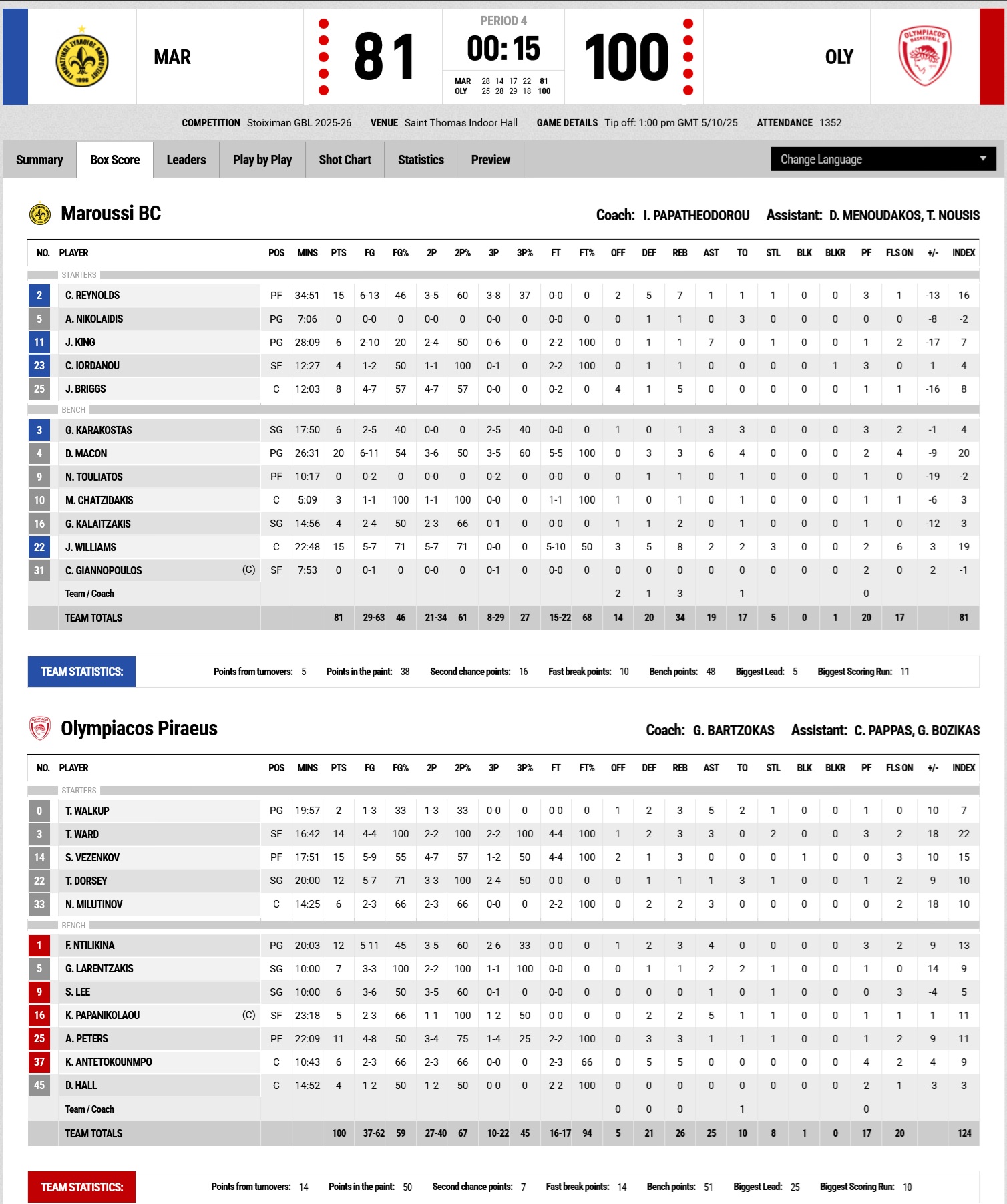 In the final period, Saben Lee made his first appearance in Giorgos Bartzokas’ lineup, scoring twice near the basket and helping Olympiacos stay firmly in control while easing the pace (63-88, 32’). The rest of the game was essentially procedural, with the 'red & whites' continuing to pile on the points. Frank Ntilikina hit a three-pointer to make it 70-91 (36'), and Kostas Antetokounmpo added an emphatic dunk for 75-96 (38'). The newly signed French guard hit another three to make it 77-100, with our team cruising to a comfortable away win (81-100) in the opening round of the championship.