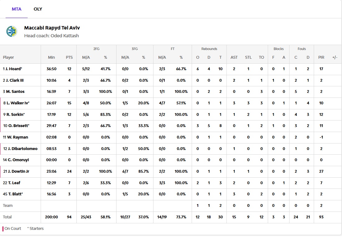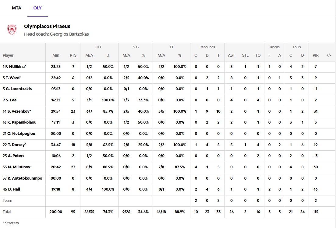 Poor shooting from beyond the arc, turnovers, and weak defensive responses allowed Maccabi to take an 8-point lead (16-9) in the first five minutes of the game. Olympiacos improved their defense afterward, and with Tyler Dorsey and Sasha Vezenkov leading the offense, they cut the deficit to just one point (16-15) and ended the quarter with a three-pointer from Kostas Papanikolaou, making it 24-22.