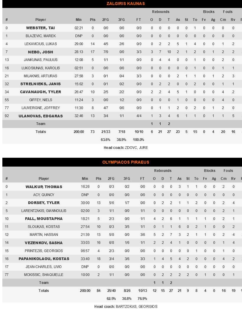 With good defense, good ball movement and offensive plurality, Olympiacos set the tempo and despite the perimeter percentages of the Lithuanians, managed to ‘build’ a +10 difference (69-79) at 37’. Zalgiris did not give up the fight, closed in to 73-79 at 39’, but a three by Kostas Sloukas permanently put an end to any hopes they were maintaining at a win. To top it all, Sasha Vezenkov tipped the ball in, writing the final 73-84!