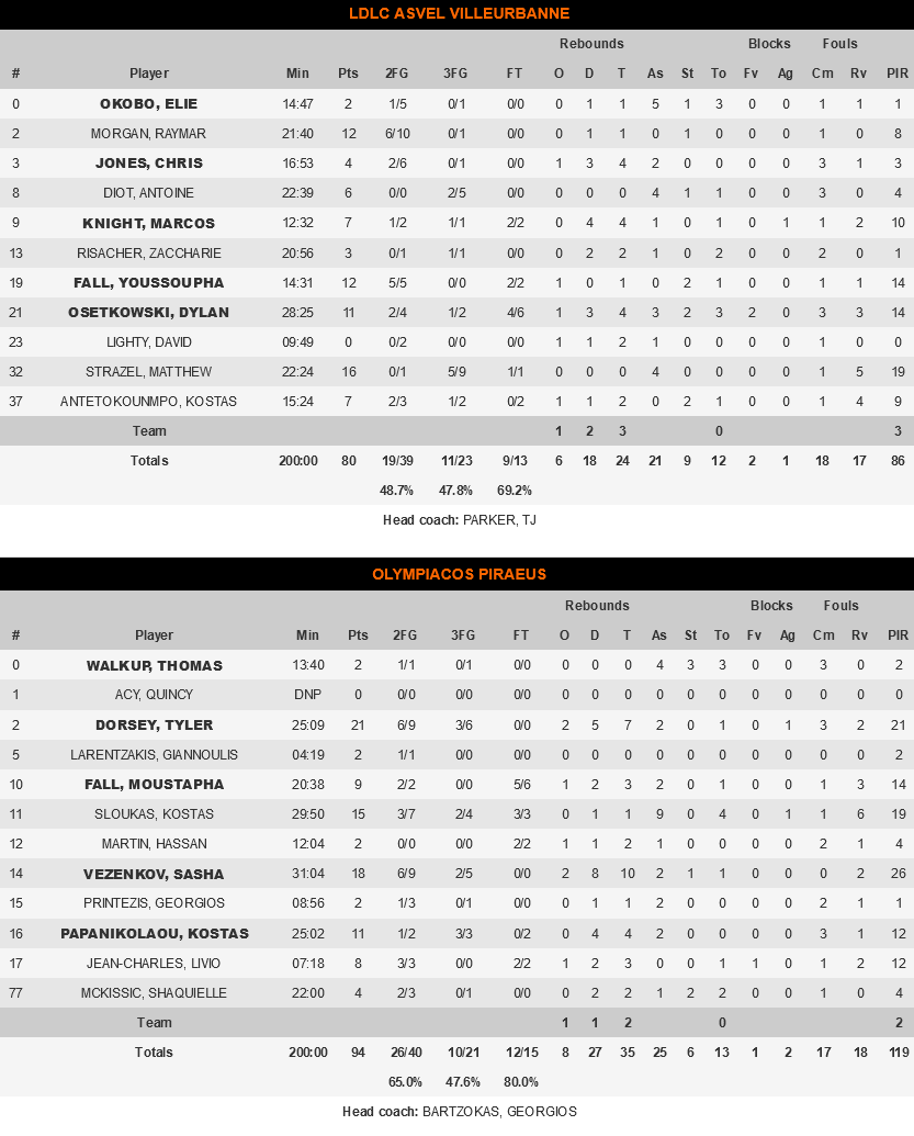 . The French won the battle under the rims, at first tied the score 54-54 at 26’ and then went ahead 64-63 at 29’. With two back to back threes by Vezenkov and Sloukas, Olympiacos closed the 3rd quarter at +5 (64-69). With pressing defense and offensive pluralism, Bartzokas’ players sent the difference to +10 for the first time in the game (68-78 at 33’). The French passed the ball to Yusufa Fall and closed in 72-78, but Olympiacos had reflexes. Relying on their defense, the ‘reds’ attacked with Vezenkov and Dorsey getting to lead with +11 (74-85 at 37’). Villeurbanne tried to reverse the situation with threes, but was way off target when at the same time Moustapha Fall and Kostas Sloukas were securing the big win.