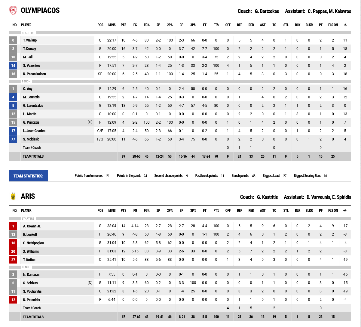 Moustapha Fall returned to action after quite a few days (he had been ill), however, the same did not apply to Kostas Sloukas, who watched the game from the side lines. The French center, although obviously impacted by his absence, got a lot of playing time in view of the derby at the OAKA.