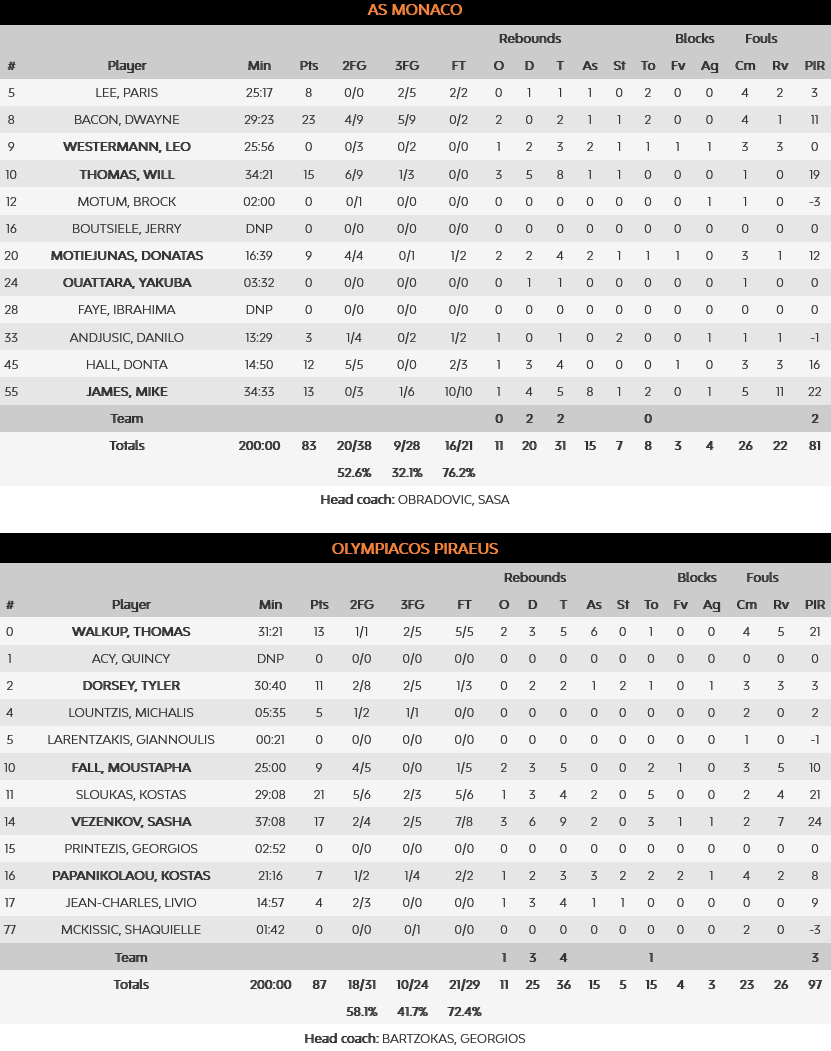 With Mike James spearheading the offense, Monaco remained in the driver’s seat up until 13’ (28-24). But Olympiacos was quick to react… They put pressure in the defense (with Jean-Charles doing a very good job in the post), found solutions with Vezenkov and Walkup and regained the lead (33-38 at 17’). With a partial 8-2 score, the hosts once again got to lead, this time 41-40, but a personal crescendo by Kostas Sloukas allowed our team to close the first half at +4 (41-45).