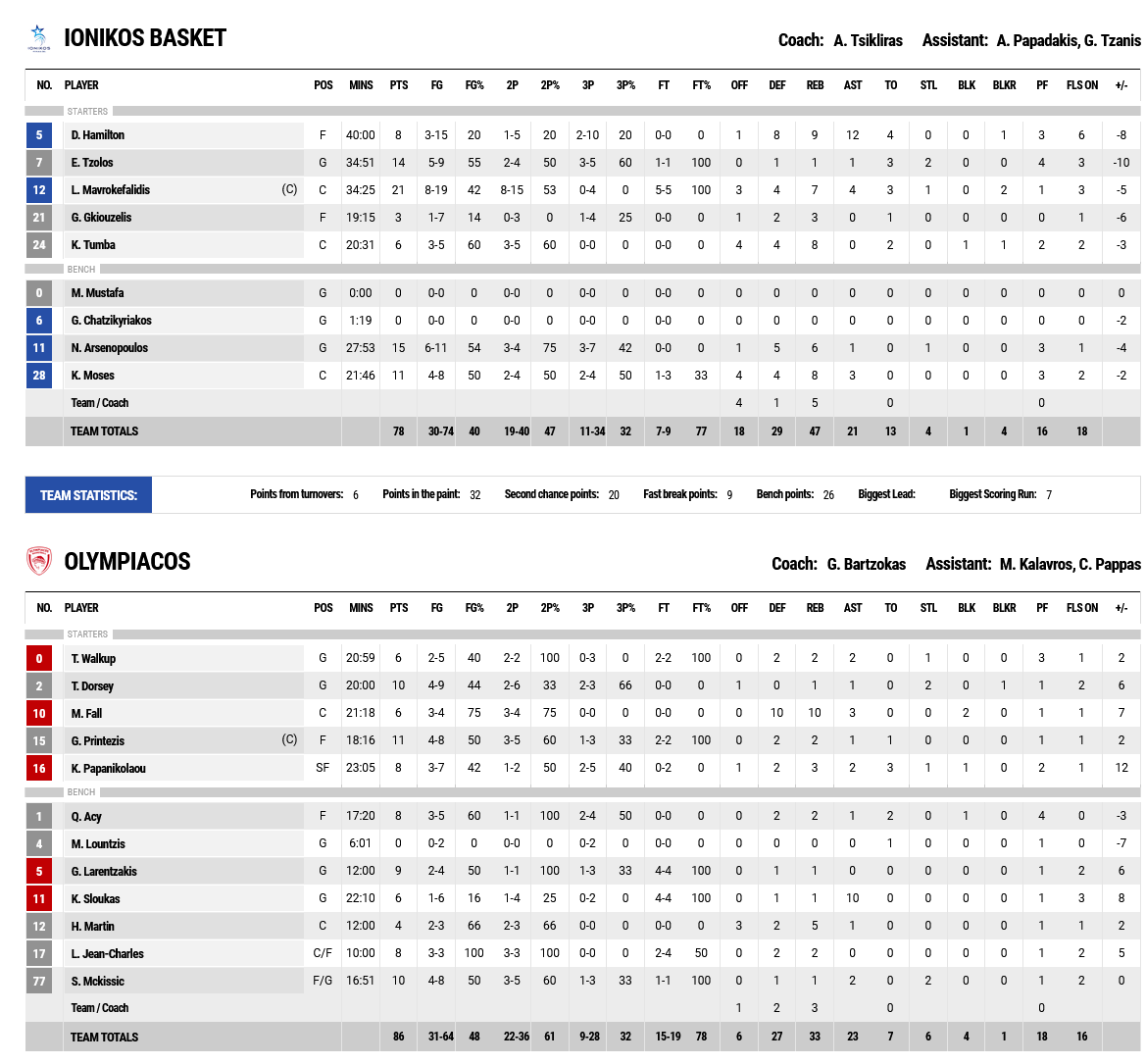 Giorgos Bartzokas’ players maintained control (39-55) up until 24’, however, turnovers and bad choices allowed the hosts to come close to 9p. (48-57 at 27’). Olympiacos closed the 3rd quarter at +11 (53-64), however, Ionikos ran a partial 7-0 and closed in even more (60-64). Quincy Acy ‘unstuck’ our team from its offensive hibernation and together with Shquielle McKissic allowed for a +10 lead (64-74) at 35’. But the hosts struck once again from the perimeter and this time they made for a three point game (73-76 at 37’). Sloukas and Walkup offered a 6 point lead for Olympiacos (76-82), Mavrokefalidis closed in 78-82, but with 4 for 4 free throws, a calm Giannoulis Larentzakis finally tipped the scales in favor of the ‘reds’ (78-86).