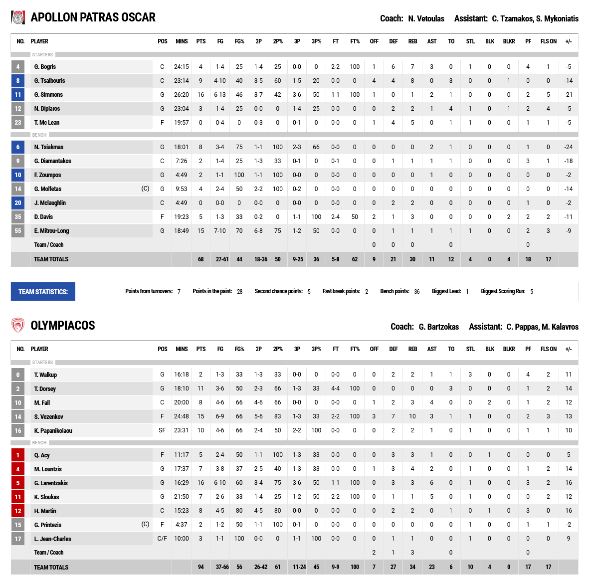 Bartzokas’ players came in even stronger in the second half… Their defense was solid, they ran the fast-break and increased the difference to 23p. (50-73 at 29’). In the last quarter, the game became more free style, the tempo went up and with it up went the difference in favor of Olympiacos (+29, 45-94 at 39’), that allowed for the win with characteristic ease.