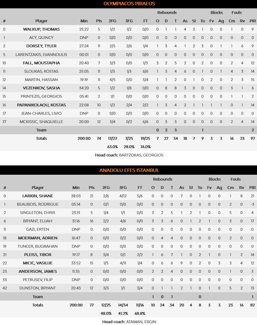 In the second half, the Turkish team opened fire from the 6,75m. and got a +11 lead (51-62 at 27’). Olympiacos however did not quit the fight… They applied pressure in defense and with Tyler Dorsey spearheading the offense, they succeeded in closing in at 3p. (63-66), by the end of the 3rd quarter. After that, the game became a first class derby, with Olympiacos breathing down Efes’ neck (70-71 at 35’), but due to the ‘reds’ poor perimeter percentages they weren’t able to get ahead in the score. 19.5’’ before the end Martin tied the game (74-74), but a Micic scored a three almost at the buzzer and gave Efes the qualification. It was impossible for Olympiacos to change their fate in the 0.02’’ remaining…