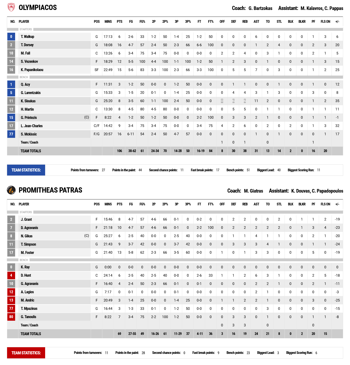 Relying on the its good perimeter percentages, our team increased the distance even more (+24, 61-37 at 23’). The Patras team tried to get back in the game with hard defense (65-41), however, Tyler Dorsey and Kostas Papanikolau saw that the order was immediately restored (+29, 82-53 at 31’). Despite the game having been decided, Bartzokas’ players denied slowing down (96-58 at 35’). The 100p. barrier was brought down by Shaquielle McKissic from the 6.75m. arc (102-64 at 38’), while the widest difference was that of 30p. (104-64 at 39’).