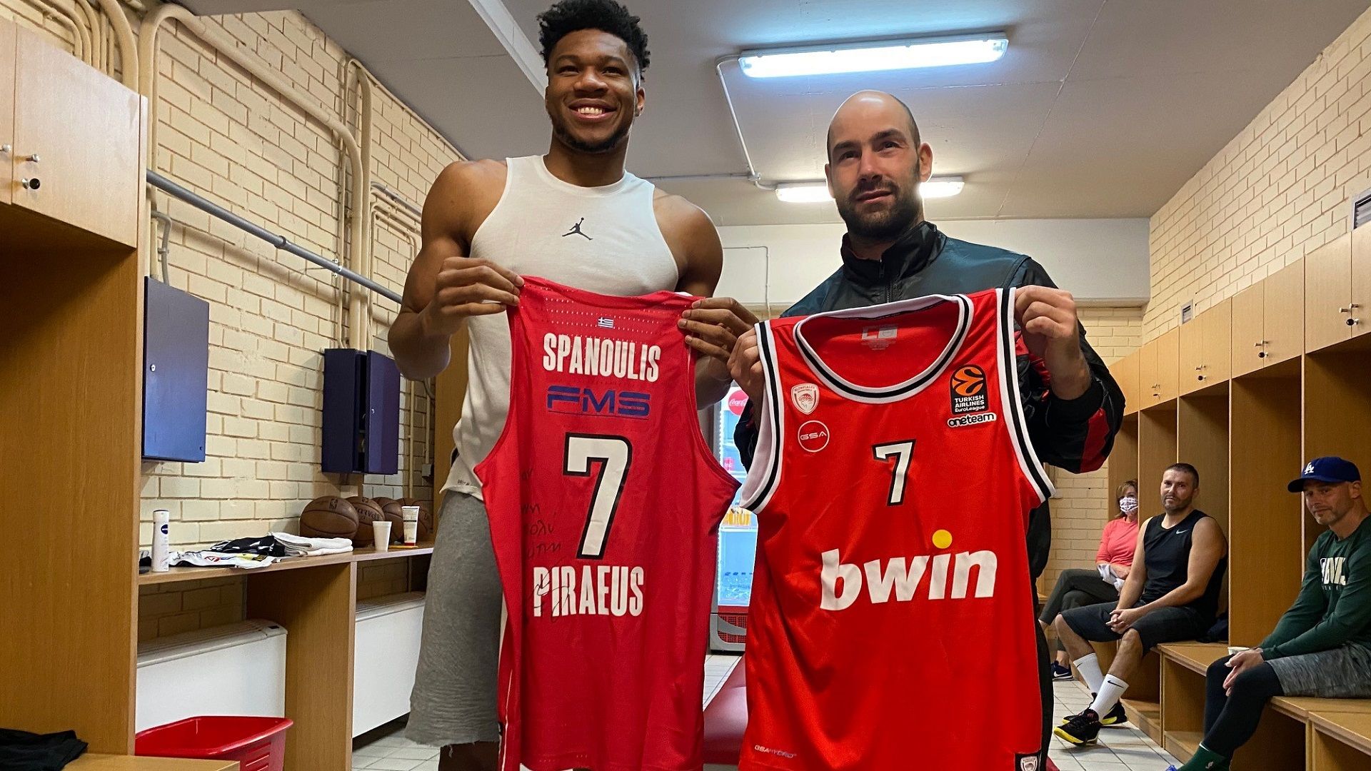 The Bucks forward and the captain of the Piraeus team had the chance to talk for quite some time before the practice session of the NBA MVP began. “V-Span” kept his promise and gave him his last season’s jersey, the one he wore during the season he became the top scorer in the history of the Euroleague and the jersey he’s been playing with this season.