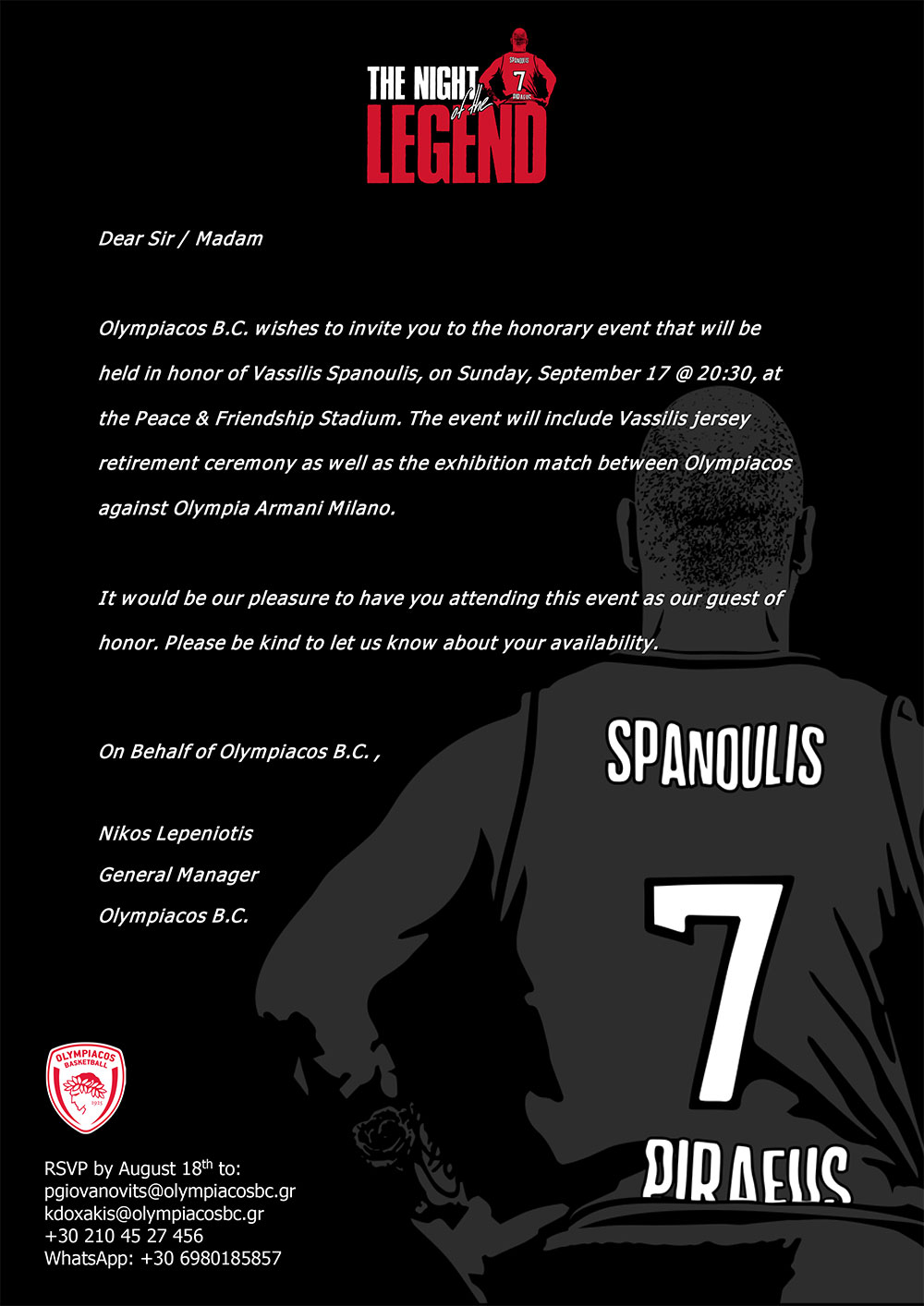Olympiacos Basketball Club wishes to invite you to the honorary event that will be held in honor of Vassilis Spanoulis,